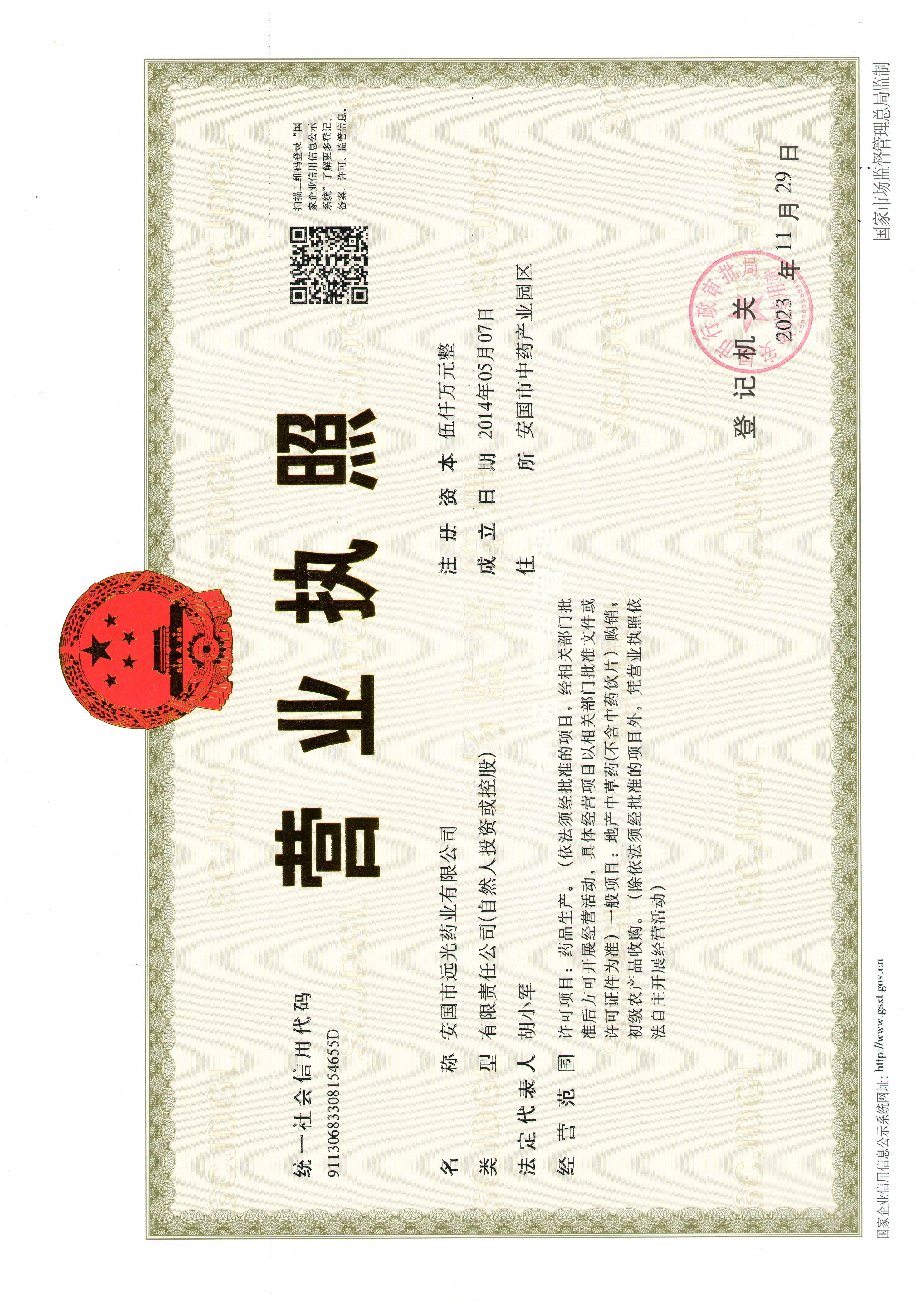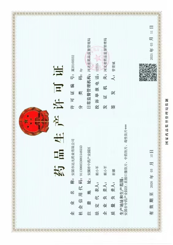 2016年3月取得河北省藥品監(jiān)督管理局頒發(fā)的《藥品生產(chǎn)許可證》,生產(chǎn)范圍為:凈制、切制、炒制、炙制、煅制、制炭、蒸制、煨制、煮制、燉制、燀制、發(fā)芽、發(fā)酵、水飛;2020年8月取得河北省藥品監(jiān)督管理局頒發(fā)的《藥品GMP符合性檢查結(jié)果通知單》(編號:冀中藥符2020008);增加了生產(chǎn)范圍:中藥飲片(直接口服飲片);2021年3月經(jīng)河北省藥品監(jiān)督管理局行政批復,換發(fā)了《藥品生產(chǎn)許可證》,證書編號:冀20160032。